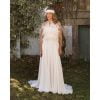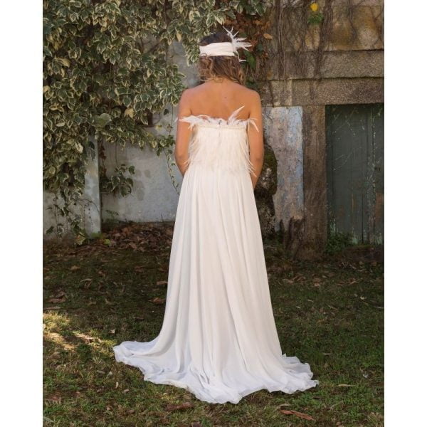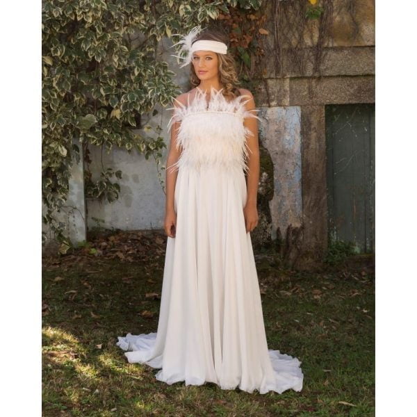 Vestido largo de novia estilo años 20, escote palabra de honor, corpiño entallado adornado con plumas y cenefa de pedrería, falda larga fruncida en la cintura con cola.
