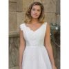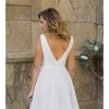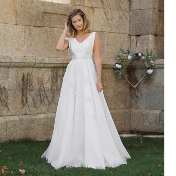 Vestido largo de novia blanco en micado y organza de seda, escote en V en delantero y espalda, corpiño entallado, falda evasé y apliques de flores bordadas.