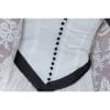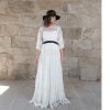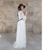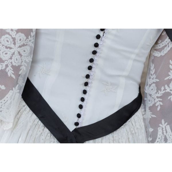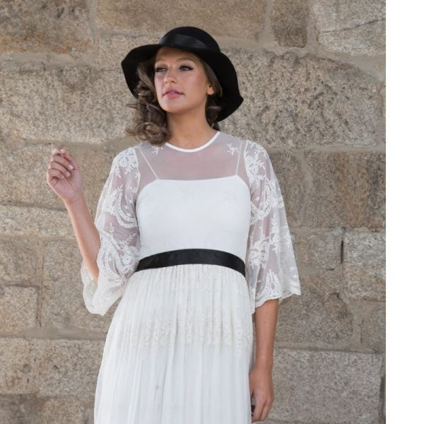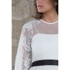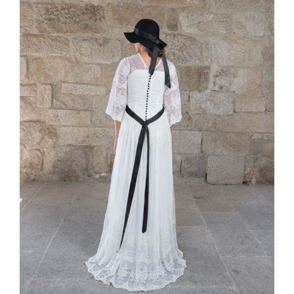 Vestido largo de novia encaje en blanco roto, escote redondo con transparencia, manga francesa fluida, corpiño entallado, falda fruncida en la cintura, bajo con evasé y cola. Complementado con lazo y botones negros en la espalda.